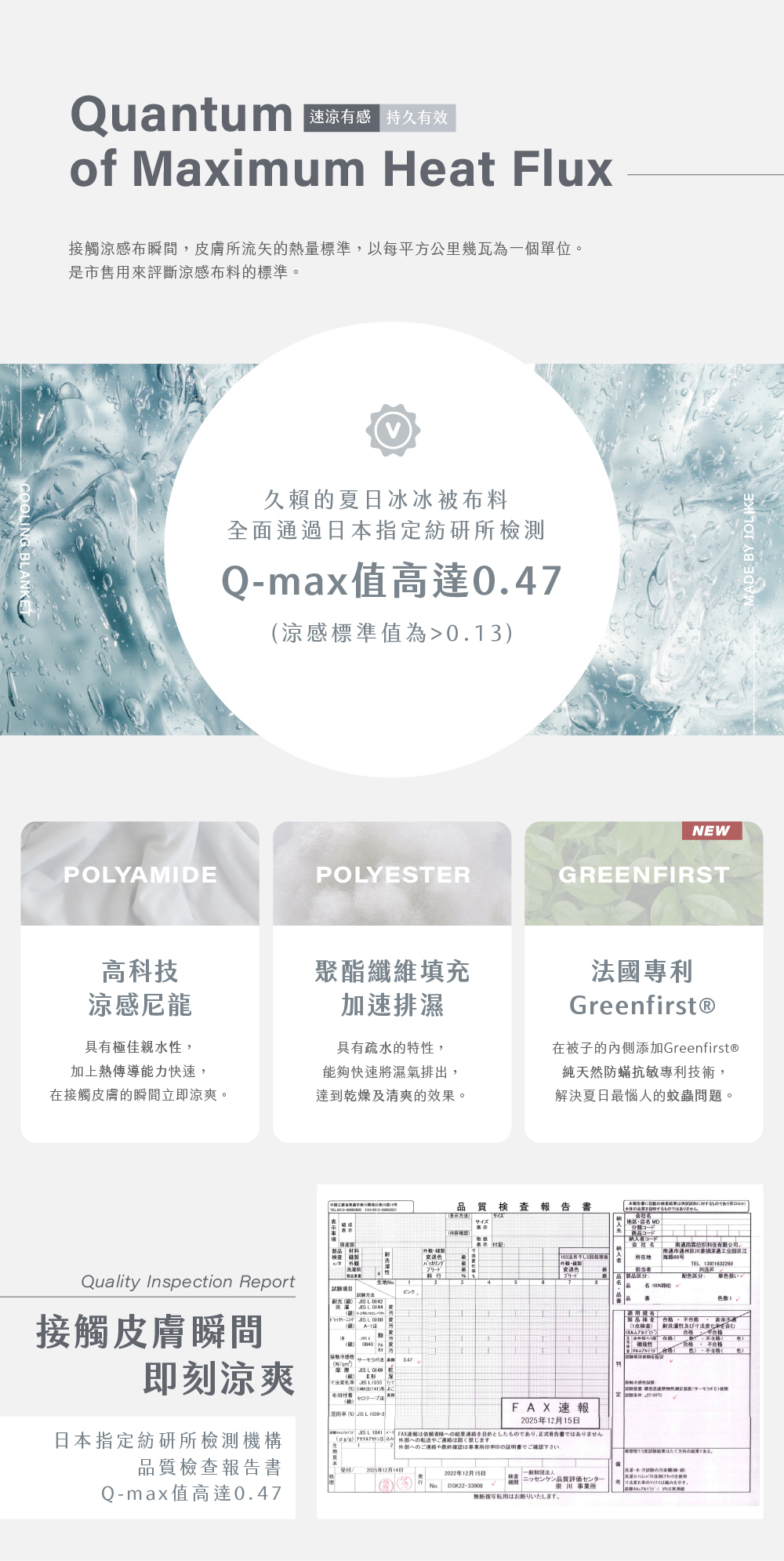• 日本紡研所驗證,Q-MAX值高達0.47